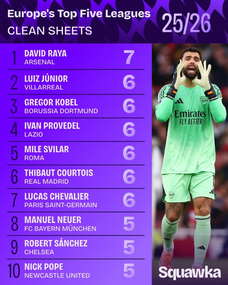 Cuộc chiến ở 5 giải đấu lớn sắp tiếp tục. Cơ quan dữ liệu squakwa cũng tổng hợp danh sách các thủ môn giữ sạch lưới ở 5 giải đấu lớn mùa này, trong đó thủ môn Raya của Pháo thủ đứng đầu.